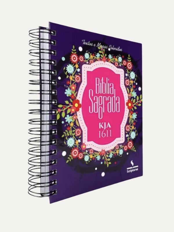 A "Bíblia King James KJA Anote" com capa espiral Textos e Mapas Coloridos e design Roxo Flores é uma edição cuidadosamente elaborada para oferecer uma experiência de estudo bíblico interativa e visualmente atraente. Esta Bíblia combina a tradição literária da tradução King James com um formato moderno e recursos que enriquecem a compreensão das Escrituras.